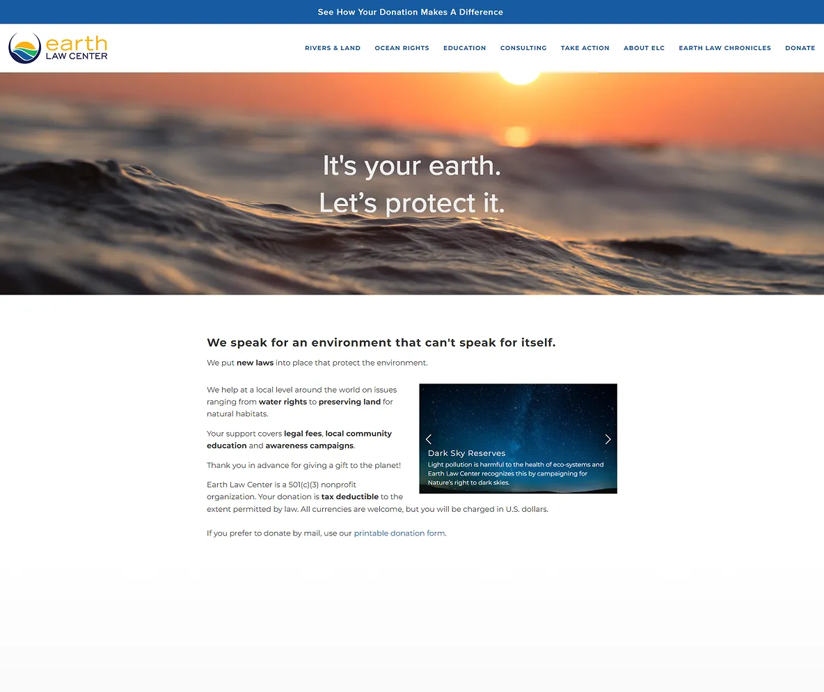 Earth Law Center was launching a Google ad campaign that would lead to the donation page so we decided to create a new donation page. The form had to stay the same but the content of the page surrounding the form could be updated.